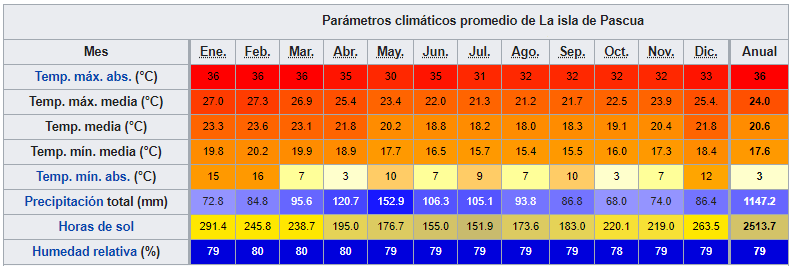 Rapa Nui has a mild subtropical oceanic climate, with pleasant temperatures year-round and little daily variation. The annual average is about 20.5°C (69°F). Rainfall is evenly distributed, with May being the wettest month and September the driest.