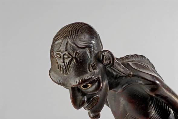 He has long, pointed ears, and very open eyes made of bone and obsidian that give him an expression between astonishment and watchfulness. Some figures have reliefs on the skull, others wear a kind of helmet, and some have been found adorned with human hair.