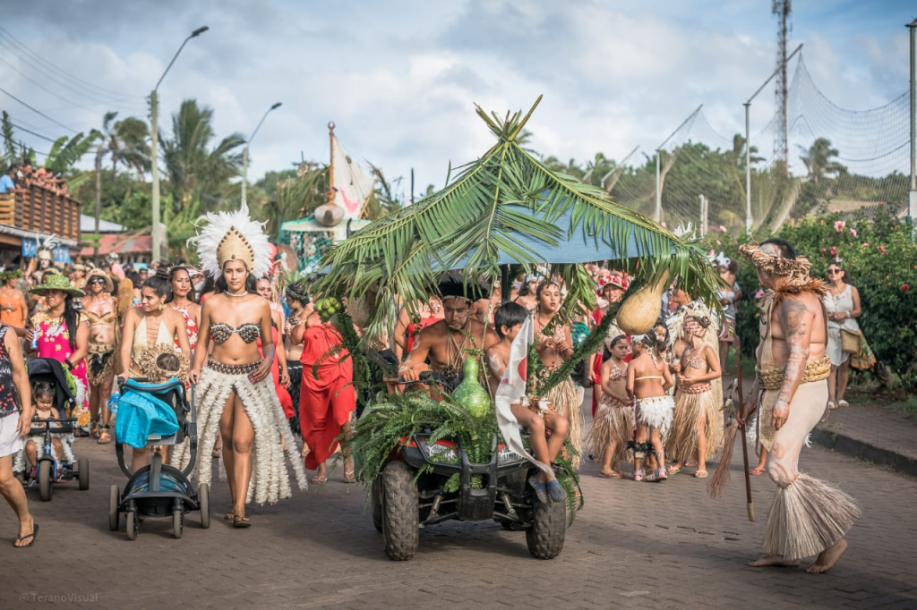 La Tapati comienza con un gran desfile en el que se presentan las candidatas a reina, cada una respaldada por su familia y clan. El ambiente es festivo, lleno de música, canto y bailes que recorren las calles de Hanga Roa.